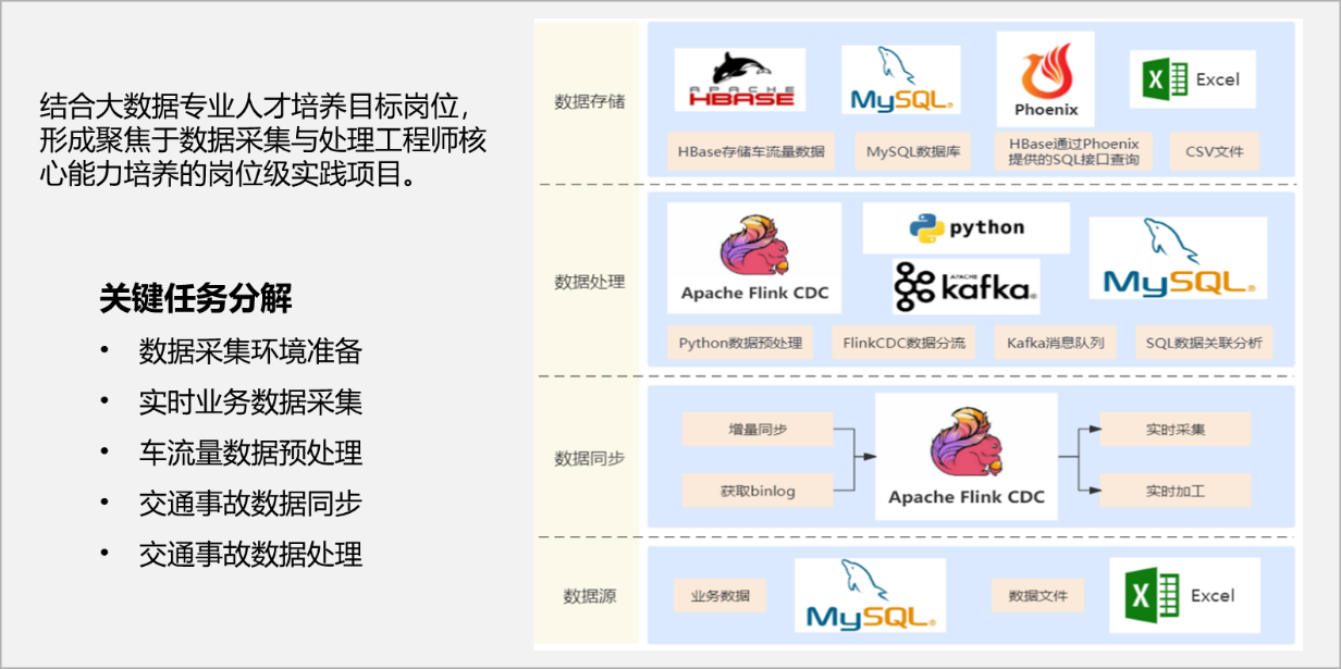 交通大数据分析与可视化实践包括车流量数据开发、实时车流量数据分析、交通事故数据分析、人群空间轨迹数据分析、数据源连接与数据集创建、MySQL数据图表设计与渲染、clickhouseL数据图表设计与渲染七个实践模块,涵盖了数据整合与关联、MySQL 数据关联分析、Flink 实时流处理与窗口函数、ClickHouse 数据存储、Python 数据分析和Superset 数据可视化展示等相关技术。