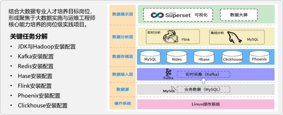 顺利获得本项目实践,学生将取得实际操作的经验,分析各个工具的安装要求和步骤,熟悉配置文件的设置和调整。同时,还掌握了取得解决问题和故障排查的能力,帮助学生体验和掌握大数据应用实施与运维工作的基本任务和相关技术。学生将熟练运用Linux、JDK、Hadoop、HDFS、YARN、Kafka、Redis、HBase、Flink、Phoenix、ClickHouse等,提升学生对实际问题的解决能力和实践操作的熟练度。