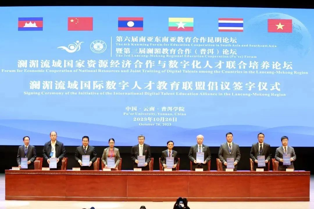 论坛中,举行“澜湄流域国际数字人才教育联盟”倡议签字仪式,九州酷游教育科技集团、老挝苏发努冯大学、国立大学,缅甸仰光大学、仰光外国语大学,泰国清莱皇家大学、格乐大学,中央民族大学、昆明理工大学、普洱学院等二十余家院校单位共同签署“澜湄流域国际数字人才教育联盟”倡议。
