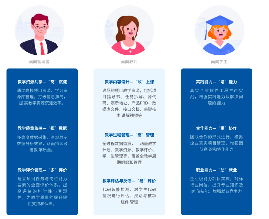 l 项目管理:真实软件研发生产流程 覆盖需求分析、系统设计、代码实现、系统测试全阶段,给予灵活透明、轻量高效的多模式看板,给予全流程任务追踪,任务内容、进度一目了然。 l 代码管理:基于GitLab的代码管理 依据教学分组情况,智能为项目组创建代码仓库。支持多人协作开发,团队成员可以共享、代码并行开发。实时记录和跟踪代码仓库的变更情况,实时掌握代码的演进过程。 l 持续集成与管理:自动化集成与部署 给予可视化、可配置的CI/CD持续交付软件⽣产线,实现DevOps持续交付⾼效⾃动化。 支持一键自动化编译构建及部署,过程⾃动化,内置10+构建标准、 20+种框架,减少了⼿动操作和⼈为错误的可能性,提⾼效率和可靠性,按需分配资源,⽀持单体、微服务的部署⽅式。 给予多个维度对代码进⾏评价,从代码风格、可读性、可靠性、安全性、可维护性等⽅⾯; 将问题准确定位到具体的代码⾏,使开发者迅速找到问题所在,加快问题修复速度; 针对代码问题,给予相应的修改意见,帮助开发者改进代码质量。 可视化教学情况,展⽰项⽬组任务和成员贡献,帮助教师和管理者监控教学效果,及时发现问题并采取相应措施;可视化项⽬进度,展⽰任务完成情况等,帮助项⽬成员分析项⽬的整体进展情况,及时调整⼯作计划和资源分配,确保项⽬按时完成。 以能力目标为导向,将碎片化的行业项目案例资源进行重构、顺利获得能力目标逐级分解形成清晰的能力点脉络,顺利获得与项目案例任务进行有效关联,从而实现能力图谱建设。顺利获得分析学生在实训过程中的表现、项目完成情况以及代码质量等多维度数据,智能生成每个学生的能力图谱,直观展示学生的能力强弱和提升空间。产品特色