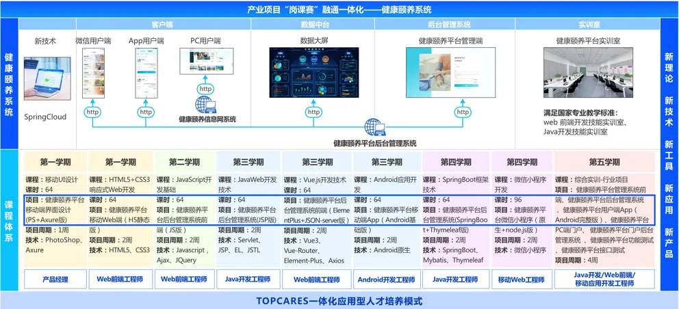 结合自身在康养领域的产业优势,将智慧健康养老业务场景贯穿融入软件开发领域的教学与技能训练,包含健康颐养平台门户、健康颐养用户端APP、健康颐养数据监控大屏、健康颐养平台管理系统4个子系统,帮助学生全方位体验产业级实战场景及典型应用。