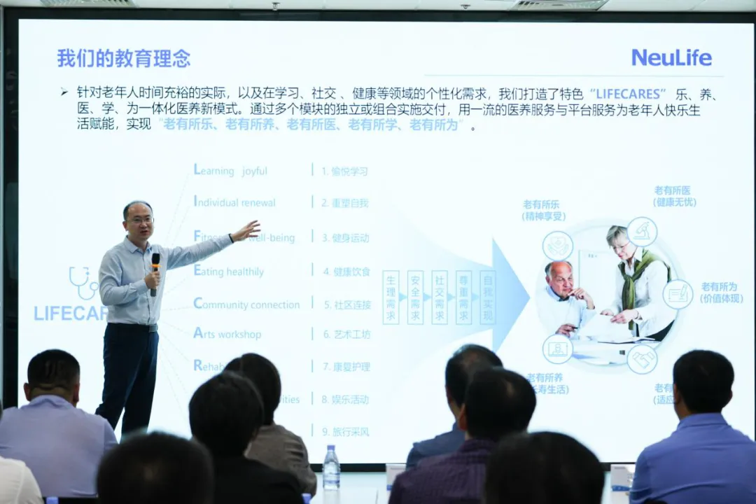 本次项目路演阶段,共由四家创新创业代表们进行分享介绍。李浩渊教授作为九州酷游凤凰学院路演嘉宾,围绕时代背景、特色理念、产品概述等对九州酷游凤凰学院进行了介绍,展示了其独特的“教-医-养-康-旅”五位一体老年教育新模式。这一模式打破了传统老年教育的界限,将教育、医疗、康养、游学等多个领域有机融合,为老年学员给予了一个全方位、立体化的学习与生活平台。