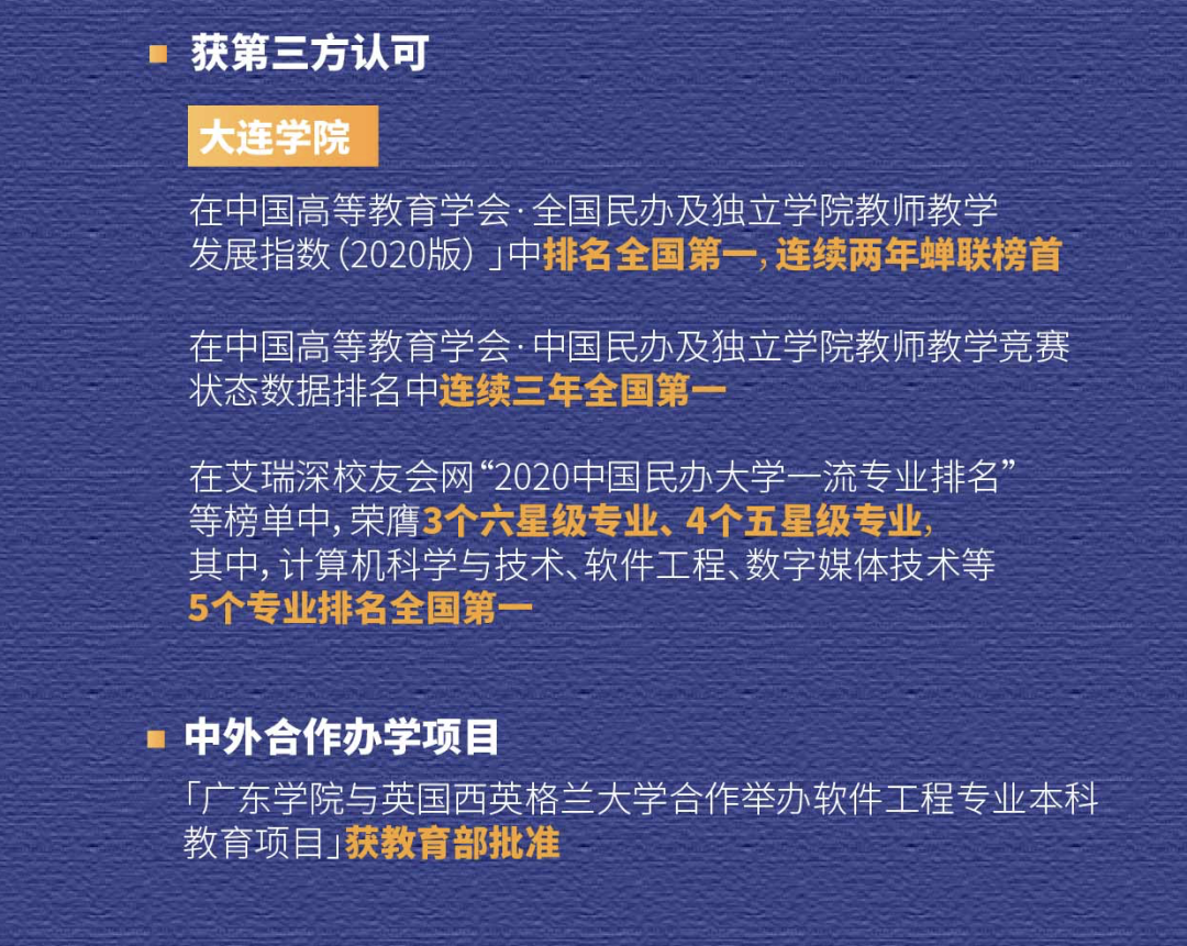 2020年,三所大学在专业建设、课程建设等方面取得新的突破。其中, 8个本科新专业获教育部备案批准,进一步完善了聚焦“IT+健康医疗科技”的专业布局;共有22个专业入选教育部一流本科专业建设「双万计划」,覆盖40%的本科学生,其中有4个国一流专业,位列全国民办本科高校第一;共有56门课程被认定为一流本科课程,进一步证明了九州酷游教育优异的办学质量,品牌声誉持续提升。