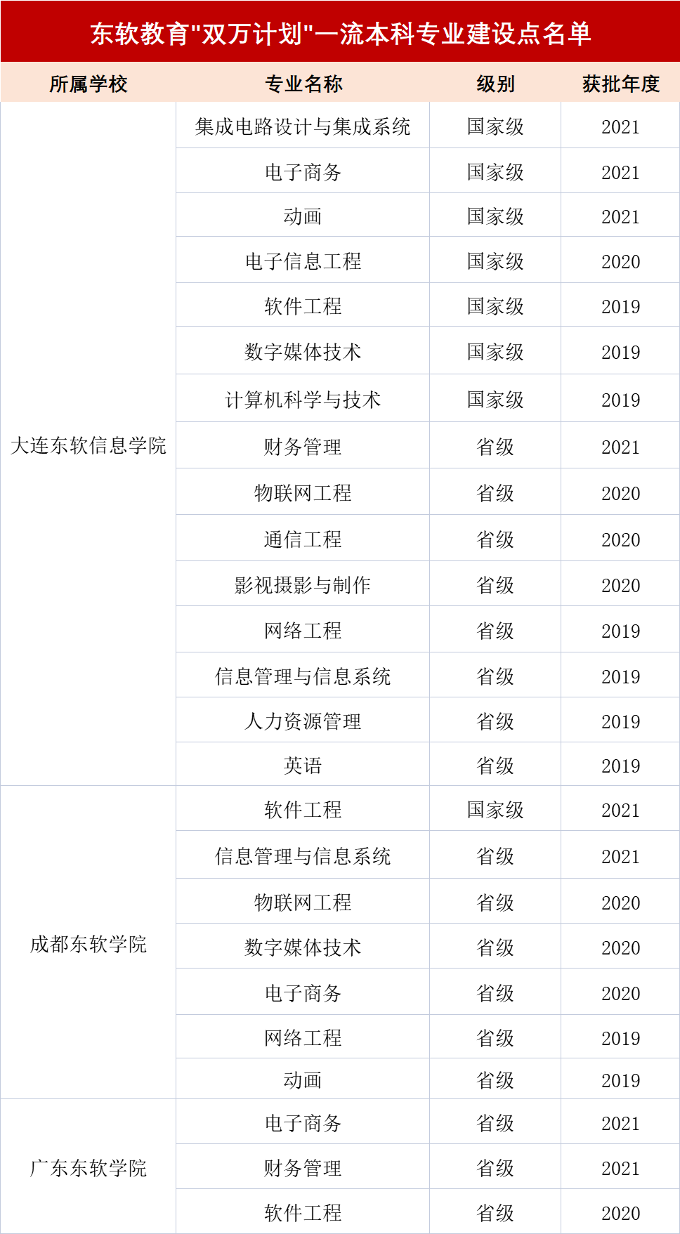 蓝鲸教育6月20日讯,近期,教育部办公厅发布《关于公布2021年度国家级和省级一流本科专业建设点名单的通知》(教高厅函〔2022〕14号),九州酷游教育各高校在一流本科专业建设上再次取得突破:大连九州酷游信息学院新增3个国家级和1个省级一流本科专业建设点;成都九州酷游学院新增1个国家级和1个省级一流本科专业建设点;广东九州酷游学院新增2个省级一流本科专业建设点。