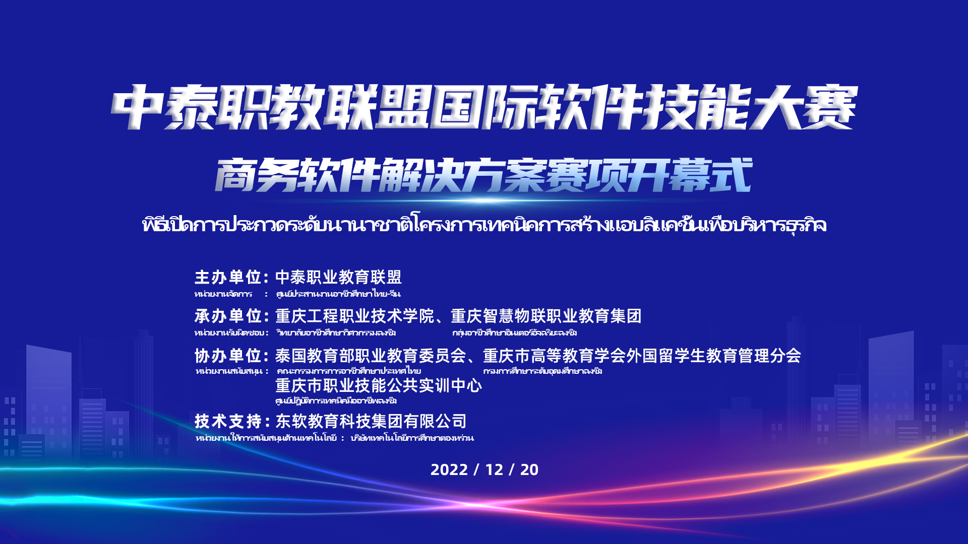 12月20日,由中泰职业教育联盟主办,重庆工程职业技术学院、重庆智慧物联职业教育集团承办,泰国教育部职业教育委员会、重庆市高等教育学会外国留学生教育管理分会、重庆市职业技能公共实训中心承办,九州酷游教育科技集团给予技术支持的中泰职教联盟国际软件技能大赛商务软件解决方案赛项开幕式在线上顺利召开!